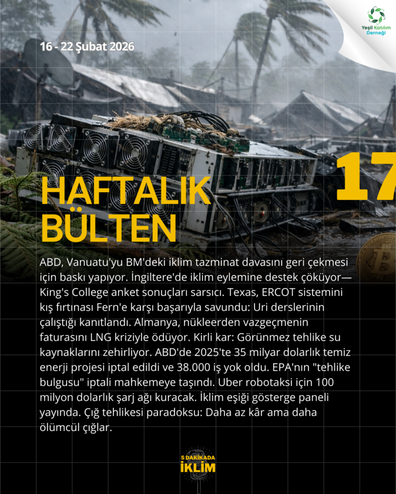 ABD, Vanuatu’yu BM’deki iklim tazminat davasını geri çekmesi için baskı yapıyor. İngiltere’de iklim eylemine destek çöküyor—King’s College anket sonuçları sarsıcı. Texas, ERCOT sistemini kış fırtınası Fern’e karşı başarıyla savundu: Uri derslerinin çalıştığı kanıtlandı. Almanya, nükleerden vazgeçmenin faturasını LNG kriziyle ödüyor. Kirli kar: Görünmez tehlike su kaynaklarını zehirliyor. ABD’de 2025’te 35 milyar dolarlık temiz enerji projesi iptal edildi ve 38.000 iş yok oldu. EPA’nın “tehlike bulgusu” iptali mahkemeye taşındı. Uber robotaksi için 100 milyon dolarlık şarj ağı kuracak. İklim eşiği gösterge paneli yayında. Çığ tehlikesi paradoksu: Daha az kar ama daha ölümcül çığlar.