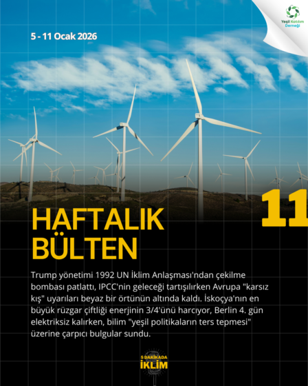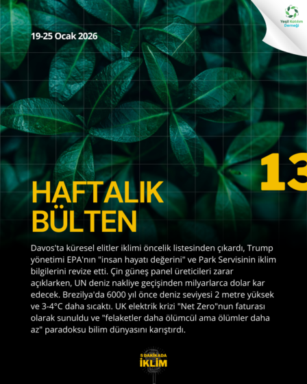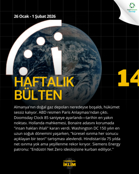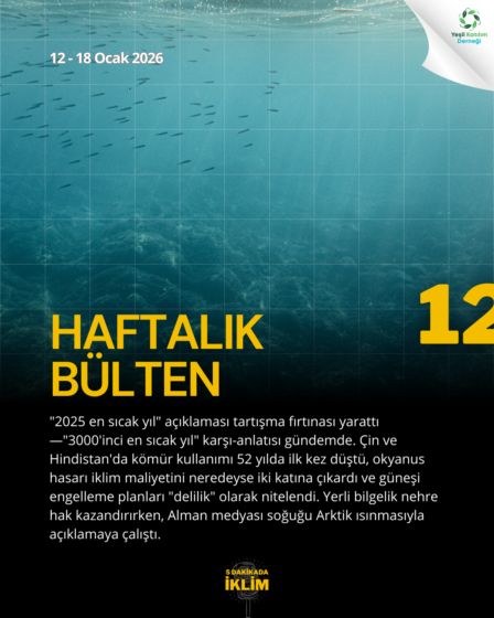 12 – 18 Ocak 2026Bu bülten 19.350 karakterden oluşuyor. Tahmini okuma süresi: 11 dakika Merhaba Değerli Okuyucular, Merhaba! “5 Dakikada İklim”in bu sayısında araştırma temelli, bağlantılı ve sadece kaynaklara dayalı zengin içeriklerle karşınızdayız. Yalnızca belirtilen kaynaklardan derlenmiş ve öznel yorum ve …