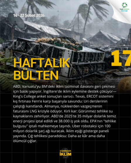 16-22 Şubat 2026 Bu bülten 25.371 karakterden oluşuyor. Tahmini okuma süresi: 14 dakika. Merhaba Değerli Okuyucular, Merhaba! “5 Dakikada İklim”in bu sayısında araştırma temelli, bağlantılı ve sadece kaynaklara dayalı zengin içeriklerle karşınızdayız. Yalnızca belirtilen kaynaklardan …